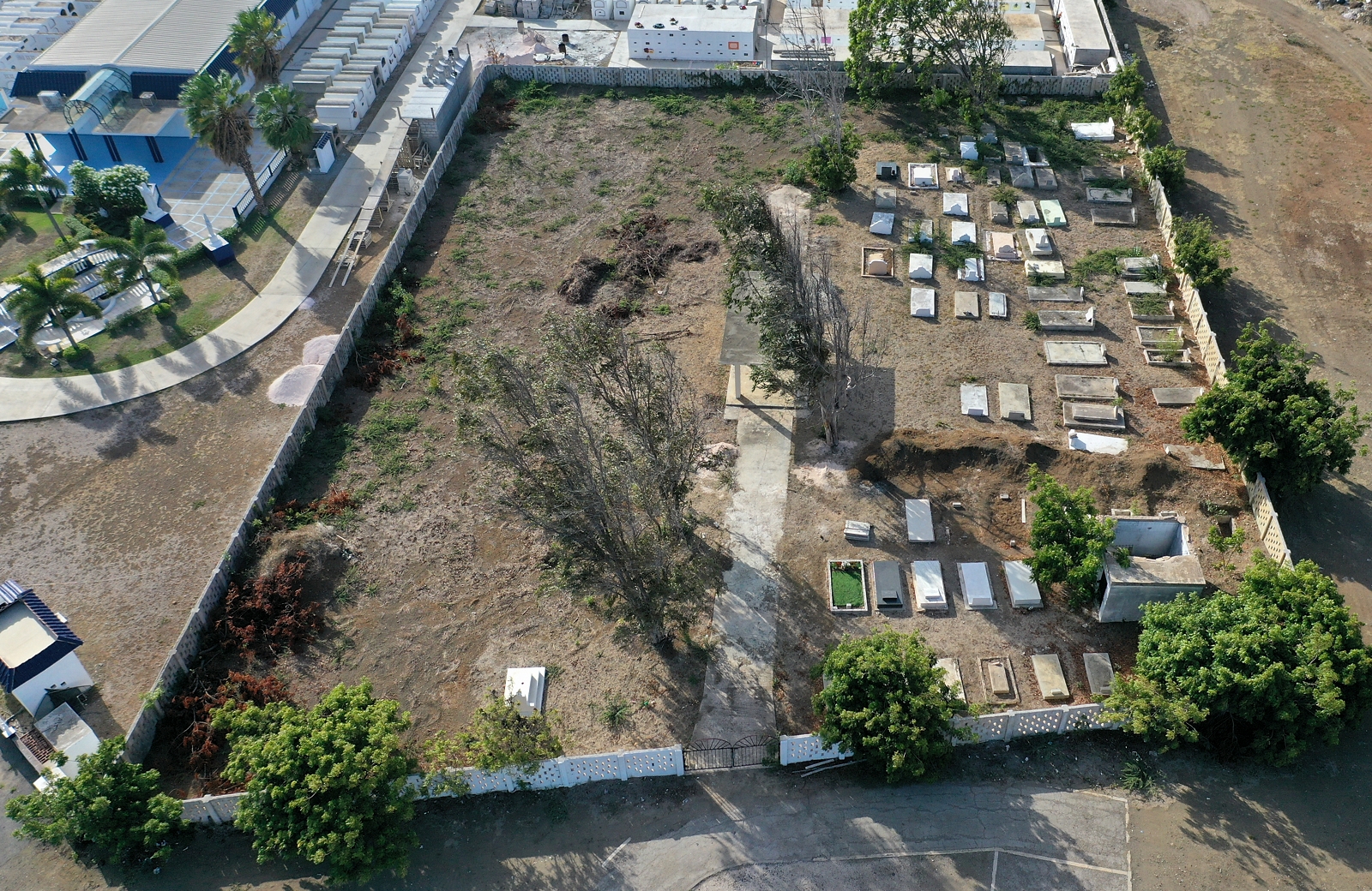 non-denominational cemetery, still in use. Reportedly, several prominent authors in the Papiamentu language are buried here.There is a large memorial to 'Doktoor Moises Frumencio da Costa Gomez (1907-1966)', with crypt, large bust, and panels, all on a raised platform. Very "upscale", with much marble in the crypts. Many graves bearing chinese characters and names, and many graves with Papiamentu text. The earliest burials noted were mid-1970s. Striking is the number of trees present and many benches provided for the comfort of visitors inside the sprawling grounds. Has a chapel inside the gates with crypts mounted along length and width of each of the longest walls. Not easy to find, it is not on a main road, and access is via dirt road running next to strip mall, or via a dirt road accessible from adjacent residential area. Ground photography July 5, 2016. Drone photography July 11, 2019. |