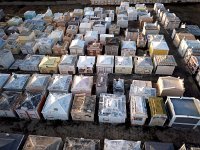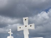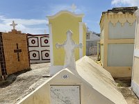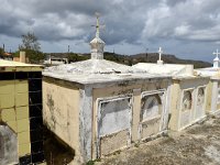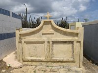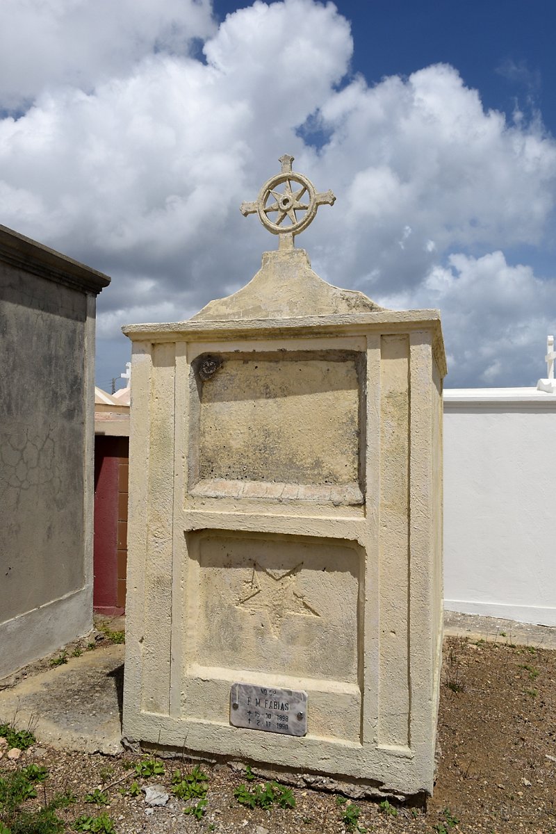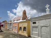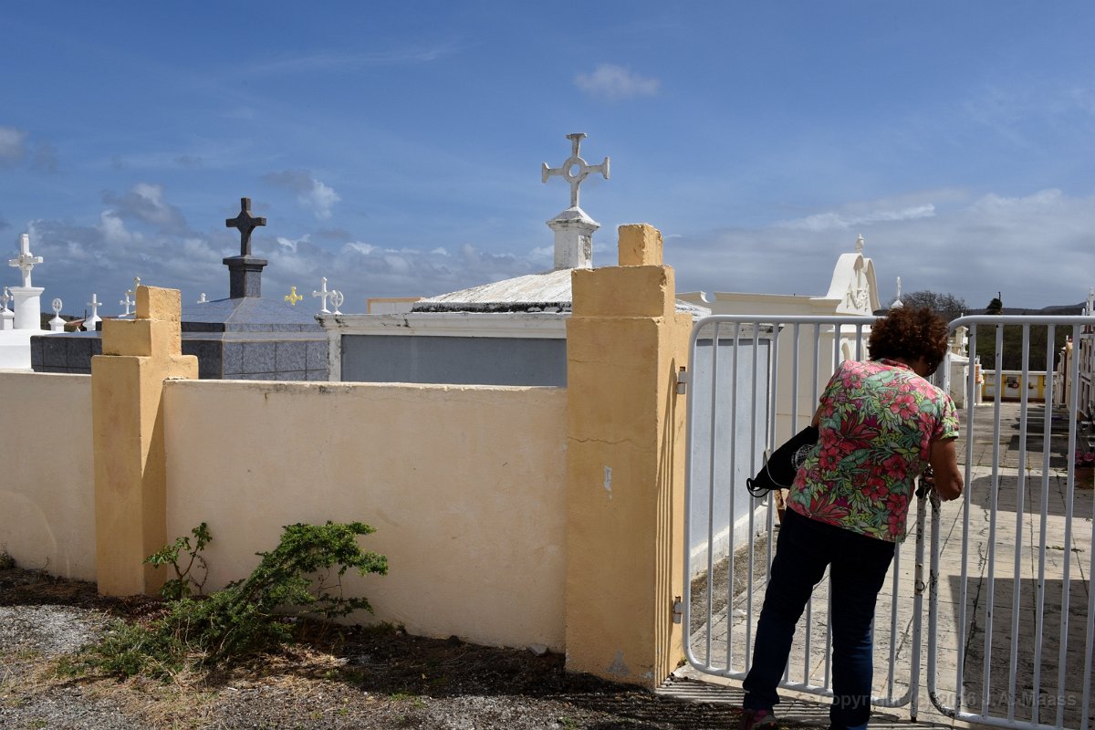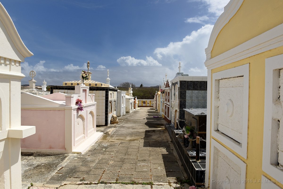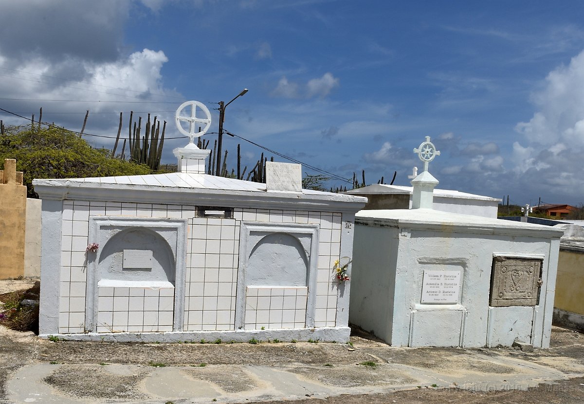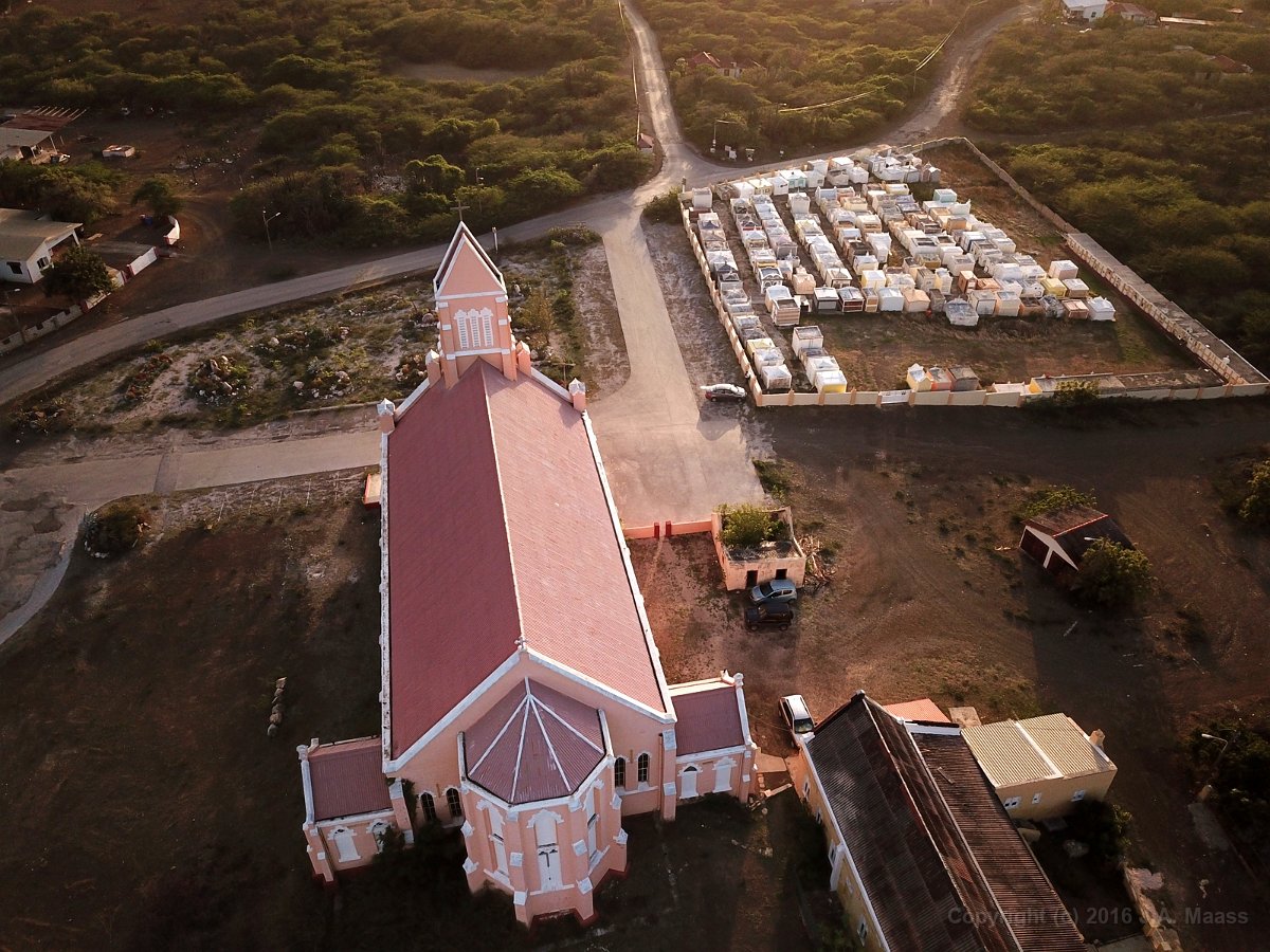 Associated with the striking Mondi Afo Catholic Church (also referred to as 'Church of San Willibrordo'), this burial ground is located in a rural area near Landhuis Jan Kok and the famous "Williwood" sign. Like all Catholic cemeteries on Curacao, it is walled and normally locked: Telephone: +599 9-864-8330 for access. Photographed July 2015, drone photography July 2018. Copyright (c) 2019 J.A. Maass